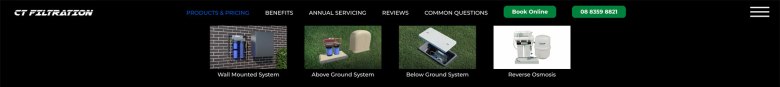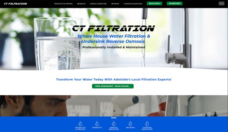CT Filtration specialises in providing whole-house water filtration solutions tailored for Adelaide’s mains water. The objective was to design and develop a website that effectively communicates the benefits of their filtration systems, enhances user navigation, and improves search engine visibility.